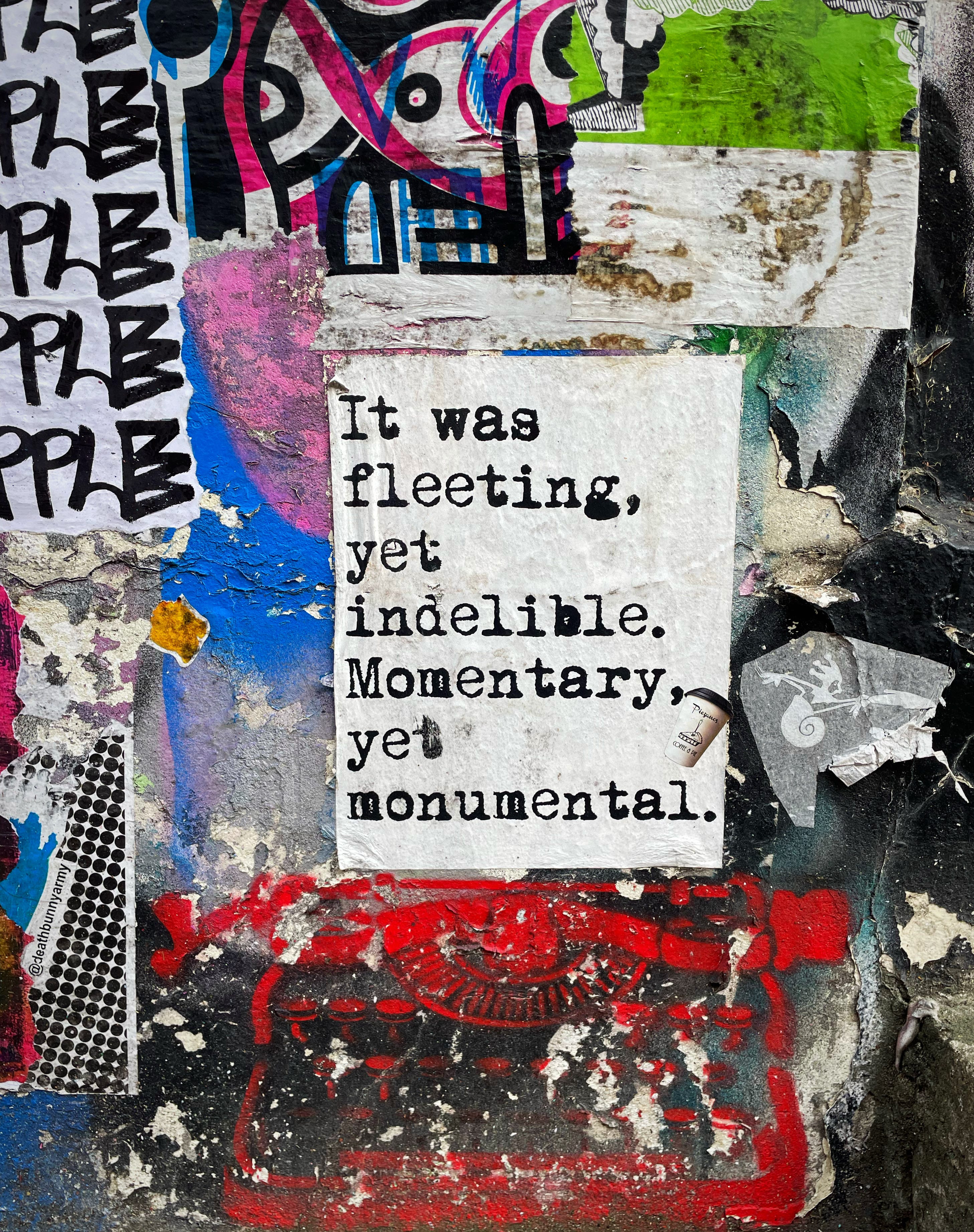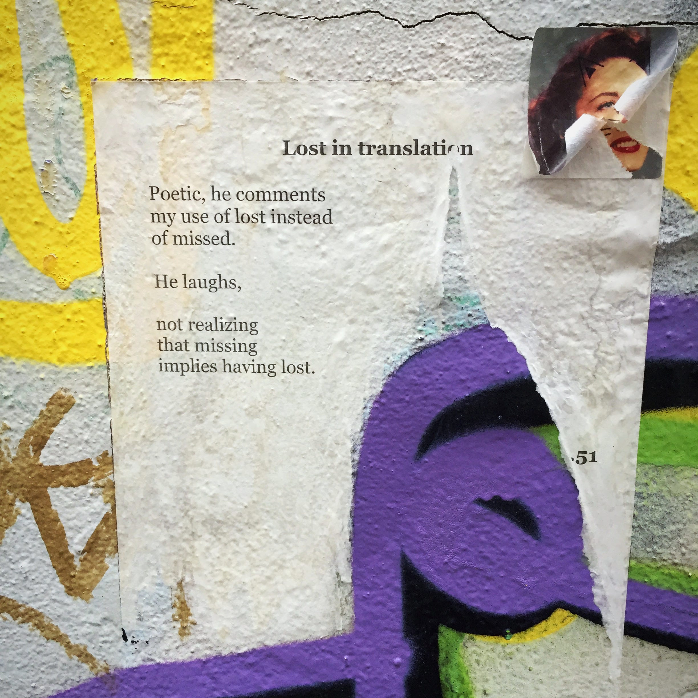 I check out the graffiti and street art – which often come with lots of words. Sometimes I find entire poems like this one from an anonymous paste-up artist whose name has been ripped from the poster: