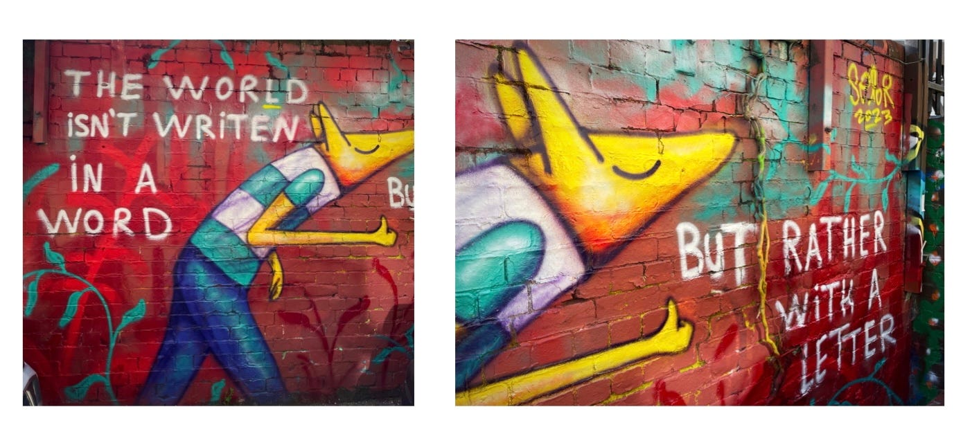 And once in a while I find a piece of art, spray painted on a wall, with a writing prompt built in, like this one from French artist David Selor. What letter to the world would you write?